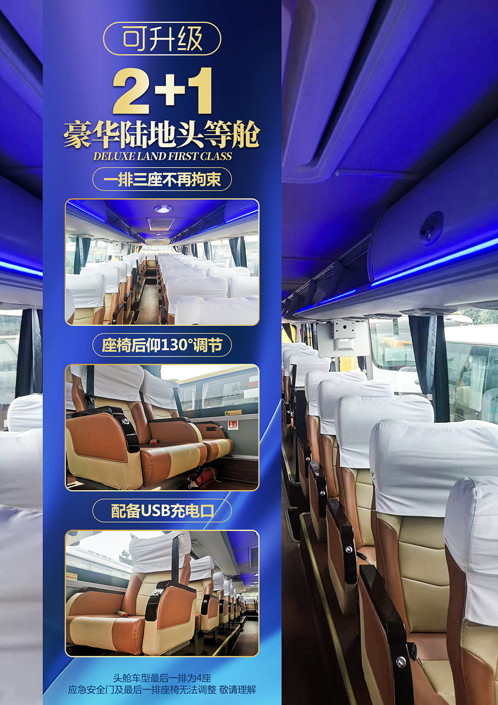 - 免费升级:豪华大巴2+1式保姆车、一排3坐、宽大舒适、带USB充电口。
